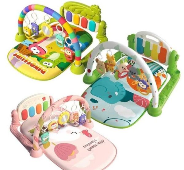 This Baby Play Mat with Activity Gym set offers endless fun and development for your little one. Available in four vibrant designs—yellow with dinosaur motifs, green with elephant patterns, pink with floral accents, and a multi-color option—each mat features a soft, cushioned surface and an adjustable activity gym. Equipped with colorful hanging toys, mirrors, and musical piano keys, it encourages sensory exploration and motor skills. Perfect for tummy time and playtime, this set is both entertaining and educational.