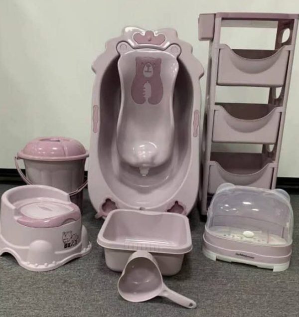 This Bear Baby Bathing Set includes a pink-themed collection of baby care essentials: a bear-decorated bathtub with a contoured seat, a potty chair, a bucket, a storage tray, a scoop, and a sterilizer with a lid. Designed with a cute bear motif, this set is perfect for infant bathing and hygiene needs. Ideal for a kiddies’ ecommerce store, it appeals to parents seeking a coordinated, practical bathing solution for their babies.